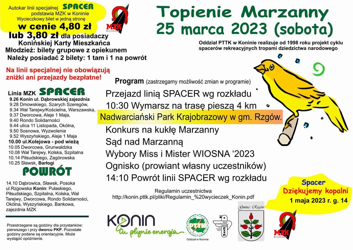 W sobotę 25 marca 2023 r. Klubu Turystyczny PTTK w Koninie organizuje tradycyjny Spacer po Zdrowie pod hasłem "Topienie Marzanny". Przejazd przez Sławsk: przystanek przy szkole i później przy sklepie Lewiatan, następnie skręt w Osieczy na Barłogi, przejazd do końca asfaltu. Osoby chętne do wsiadania powinny z daleka sygnalizować zamiar. Powrót tą samą trasą. Po drodze przewodnicy PTTK opowiadać będą o gospodarce wodnej i łąkarstwie na terenie Nadwarciańskiego Parku Krajobrazowego.